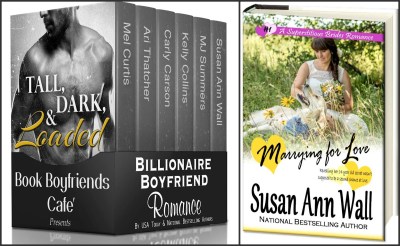 Susan is giving away a copy of Tall, Dark, & Loaded, the Billionaire Boyfriends box set in which Marrying for Love was originally published with five other novellas. To enter the drawing, complete the form linked here. If you are in the U.S., she’ll also send a signed copy of Marrying for Love.