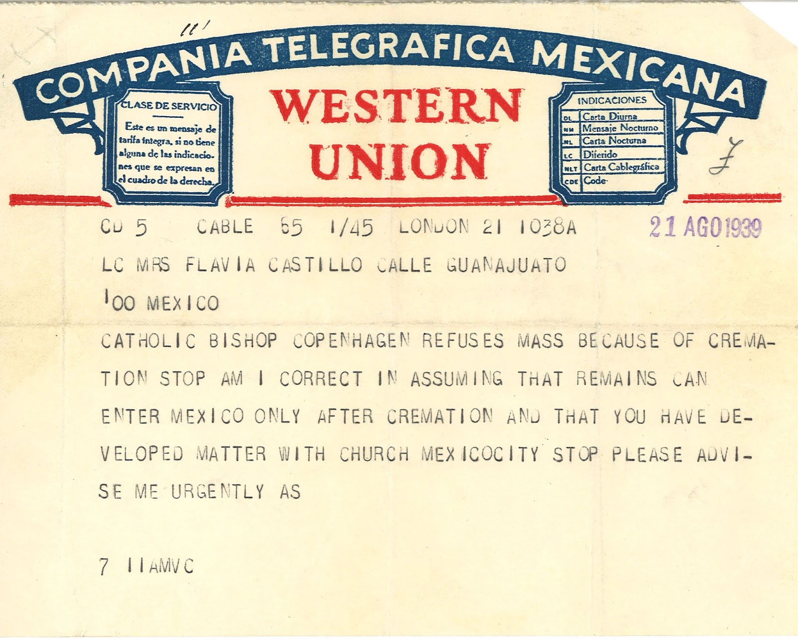In 1939 when my maternal grandfather died in faraway Denmark a Catholic cremation was not an option. Transporting a body to Mexico was not an option either. You can see the telegrams of some of the back and forth between The Catholic Church in Denmark and my family.